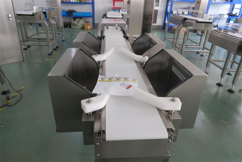 下面這幾張圖是我司工廠現貨圖分別是 多列撥桿式SG-D300檢重秤 和 氣吹式SG-150檢重機